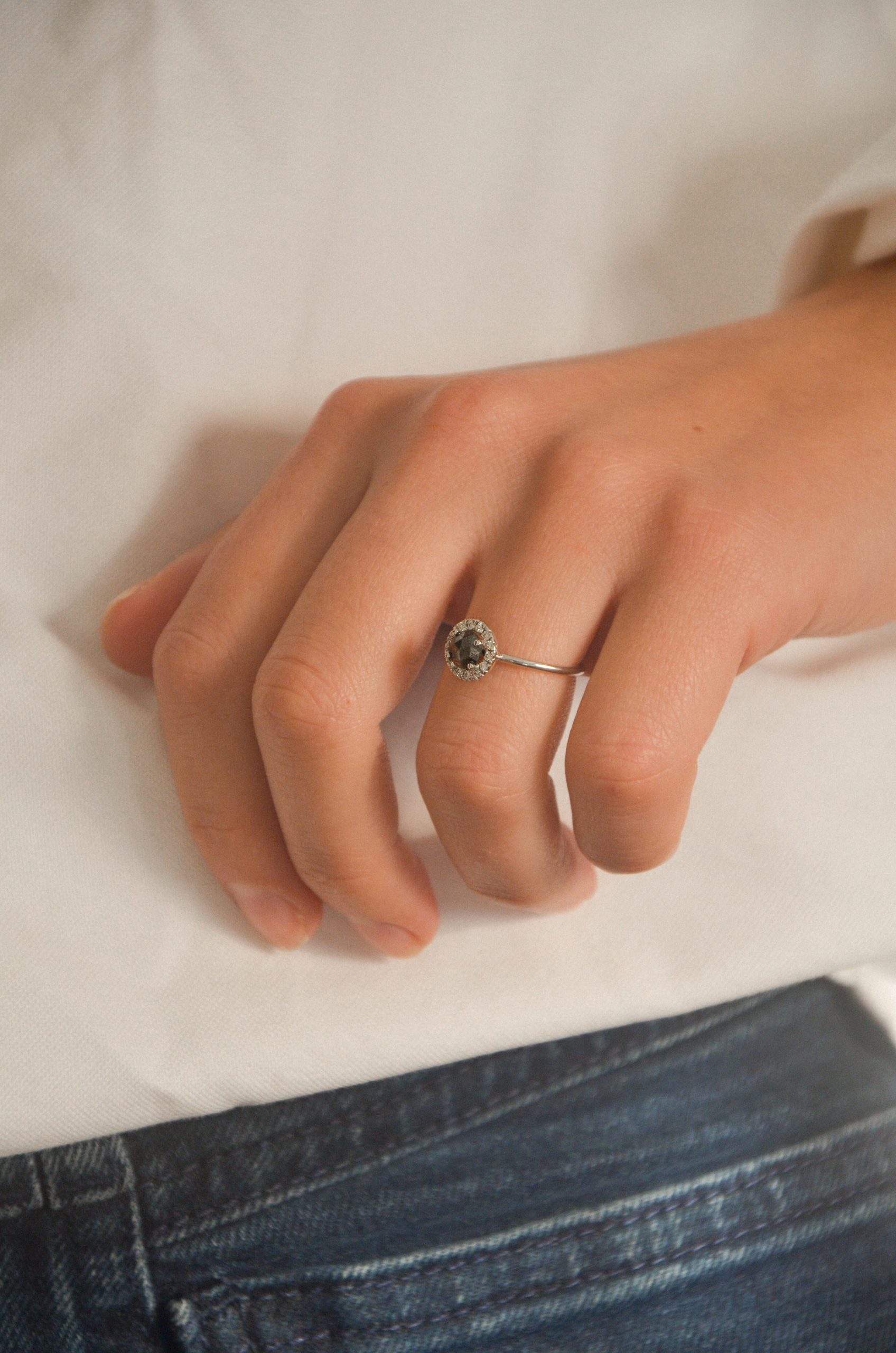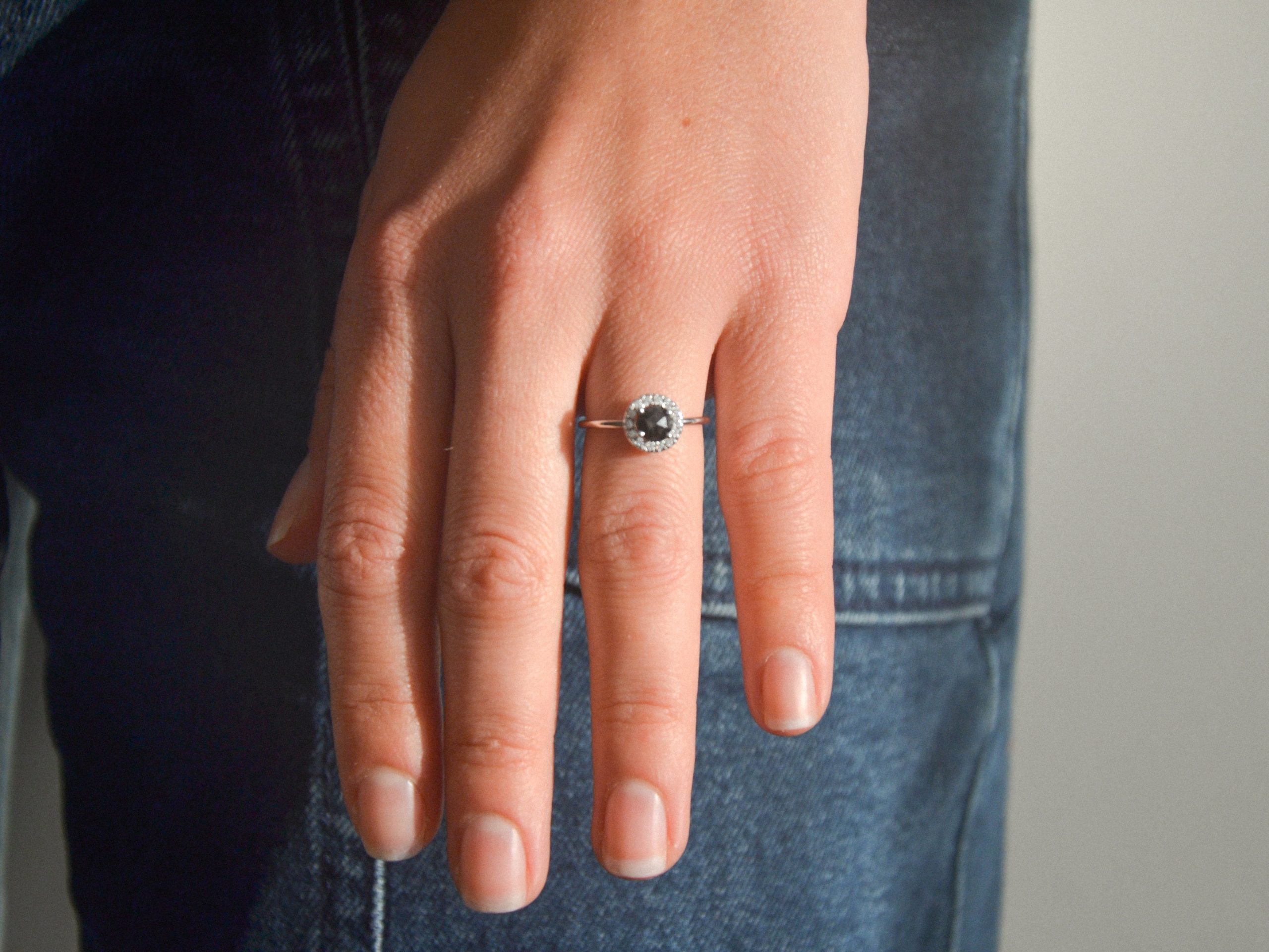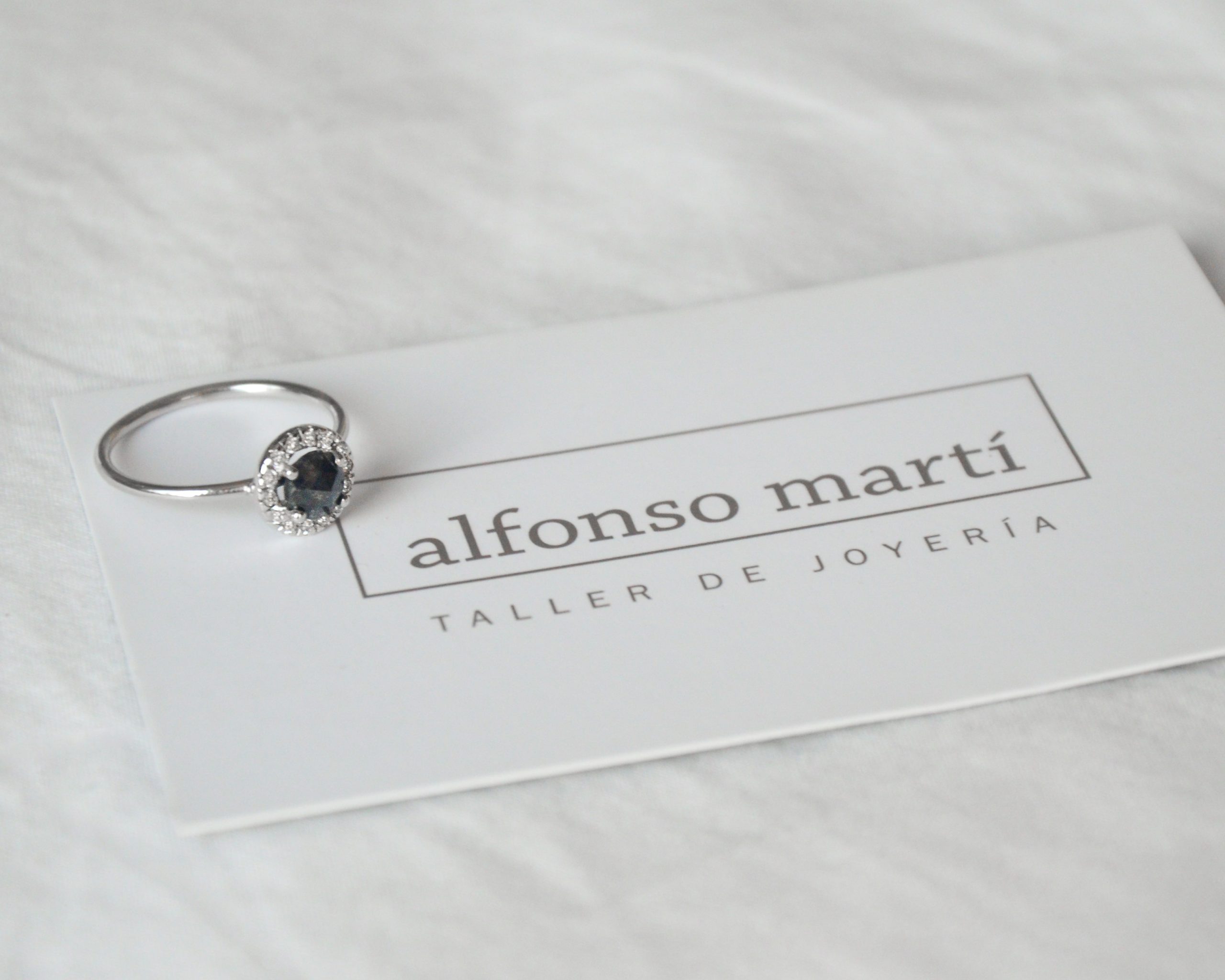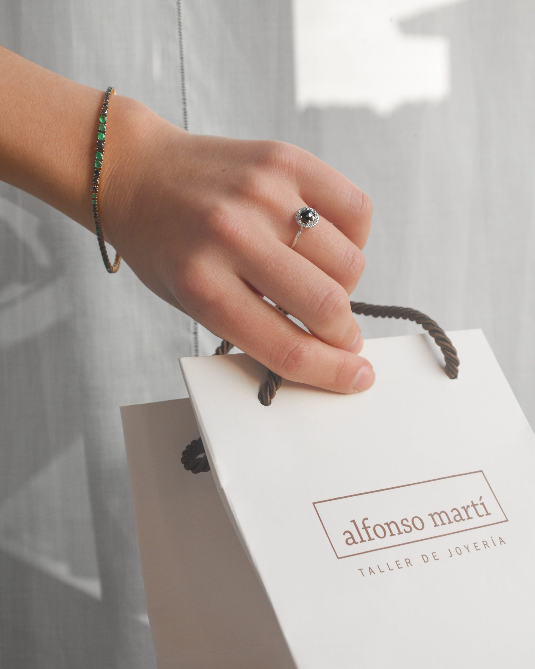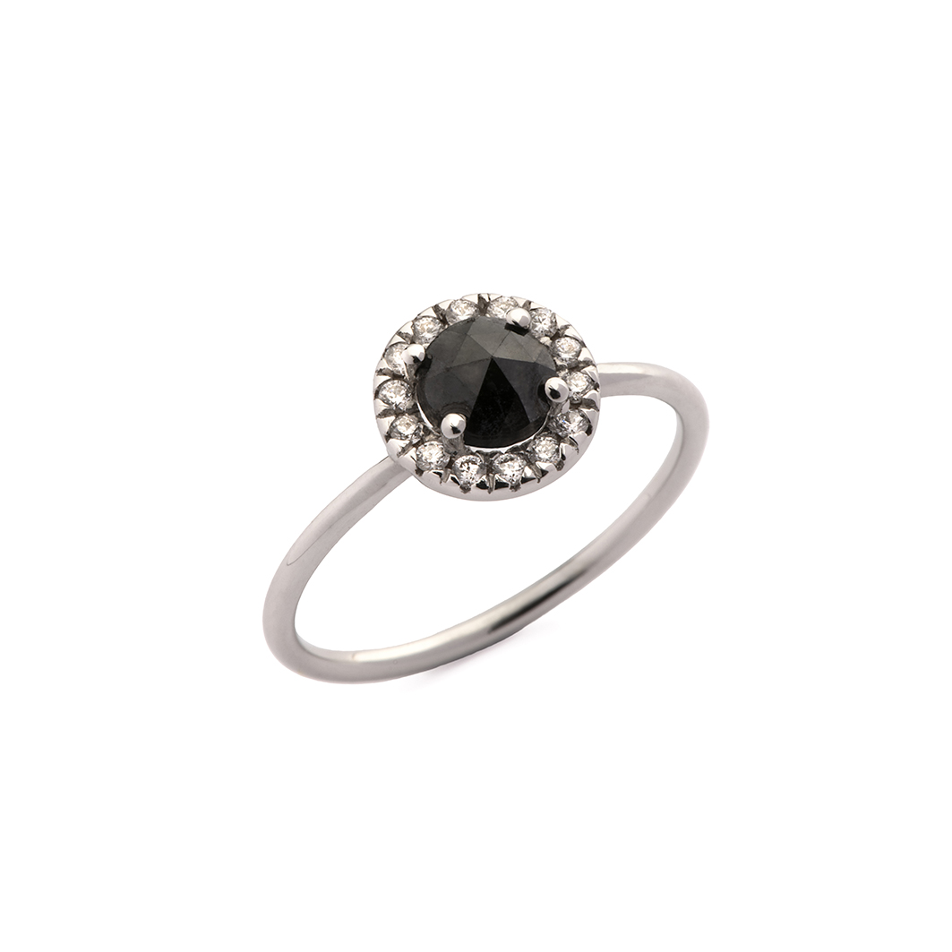 Anillo en oro de 18kt con orla de diamantes (0,14ct) y un diamante negro central de 5mm (0,50ct)