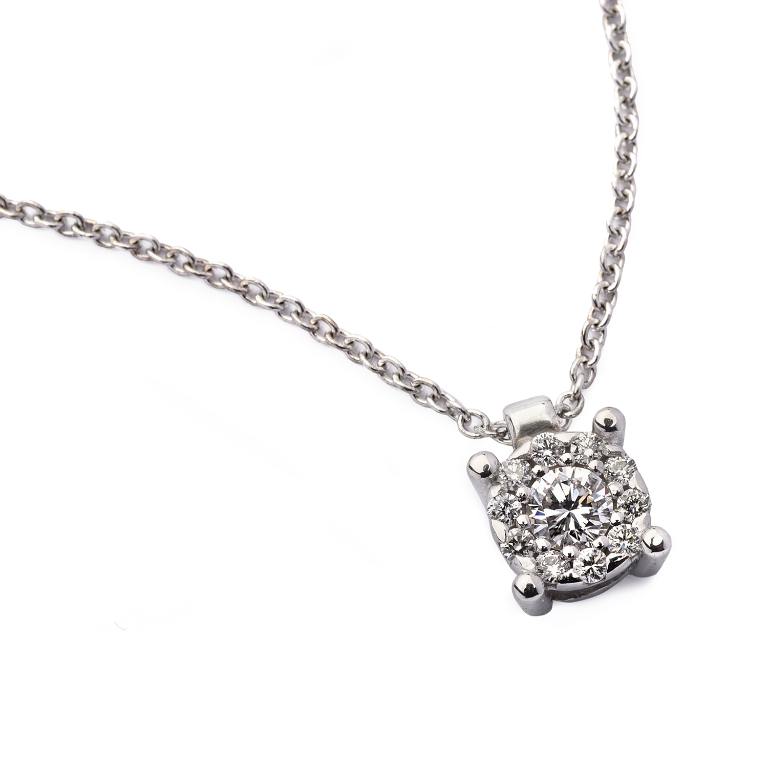 Collar con cadena de oro blanco de 18kt con diamante central de 3,6mm y orla alrededor. Total 0,33ct.