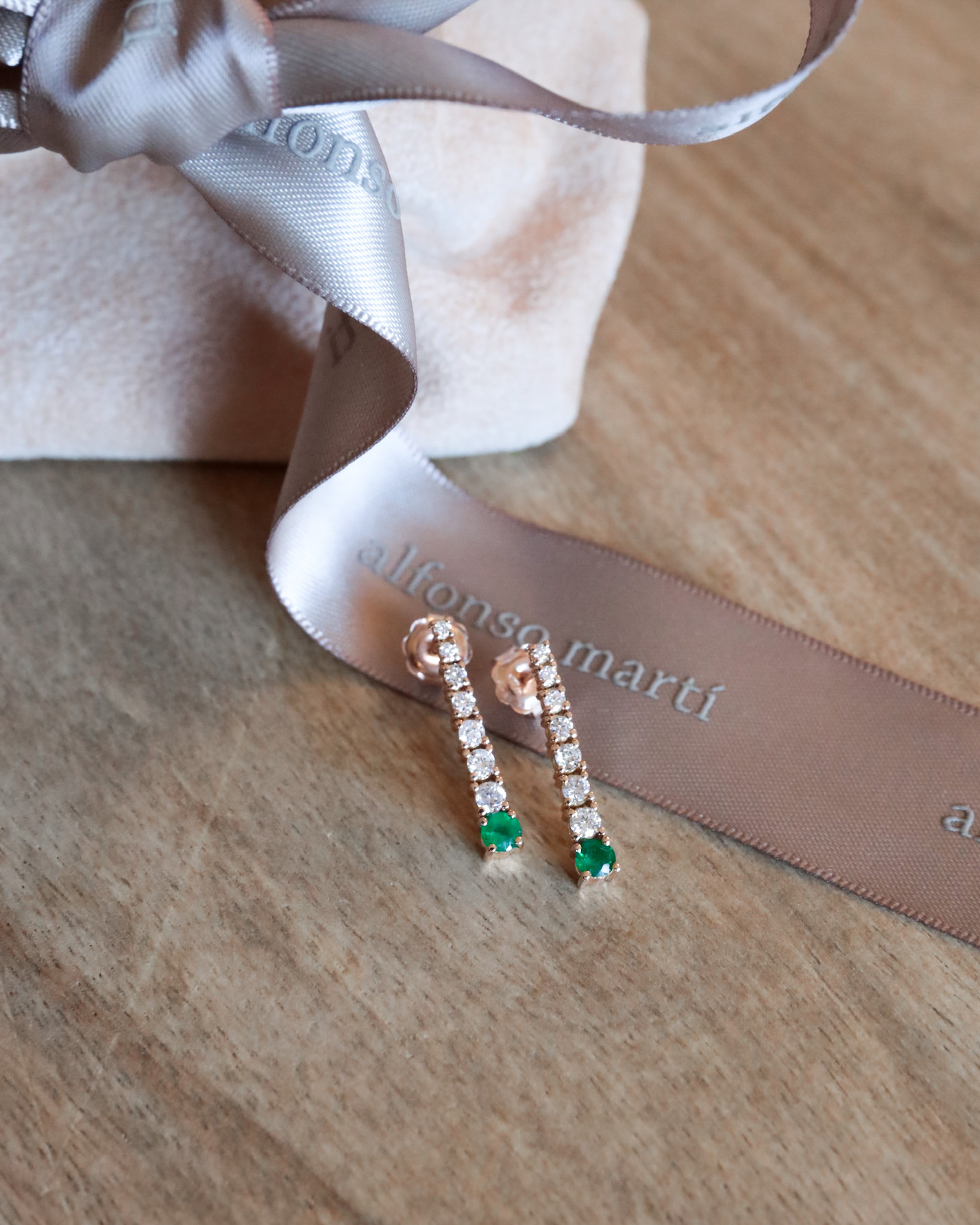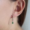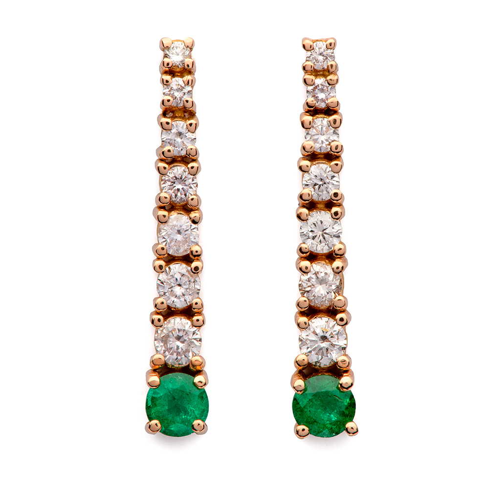 Pendiente en oro rosa de 18kt con 14 diamantes blancos y dos esmeralda de 3,80mm cada una.