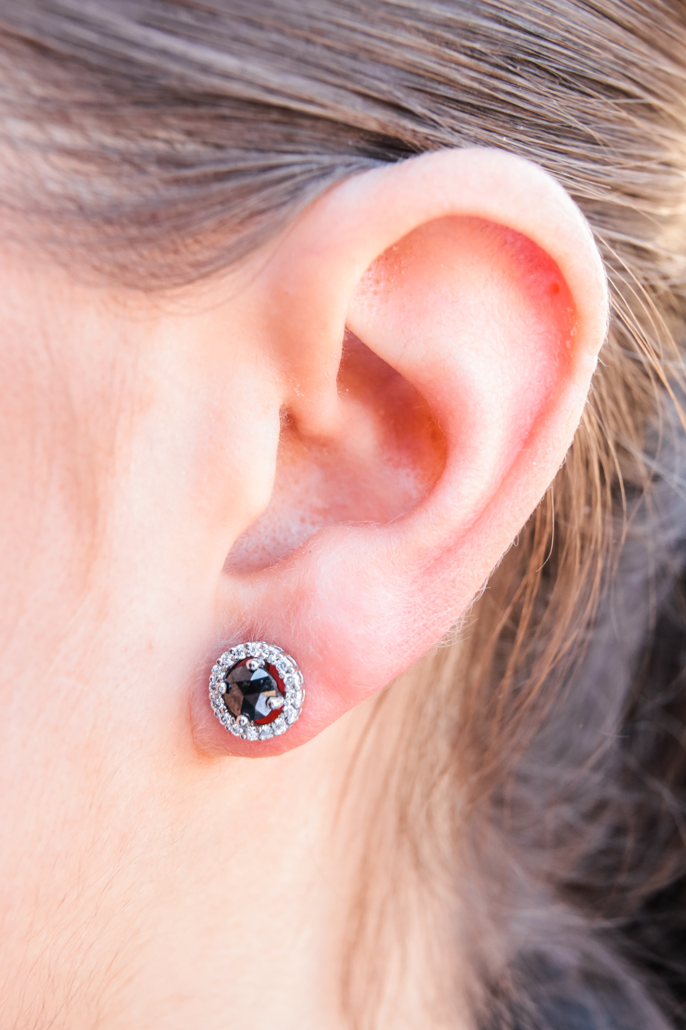 Pendiente en oro blanco de 18kt con una orla de brillantes y un diamante negro central de 4mm.